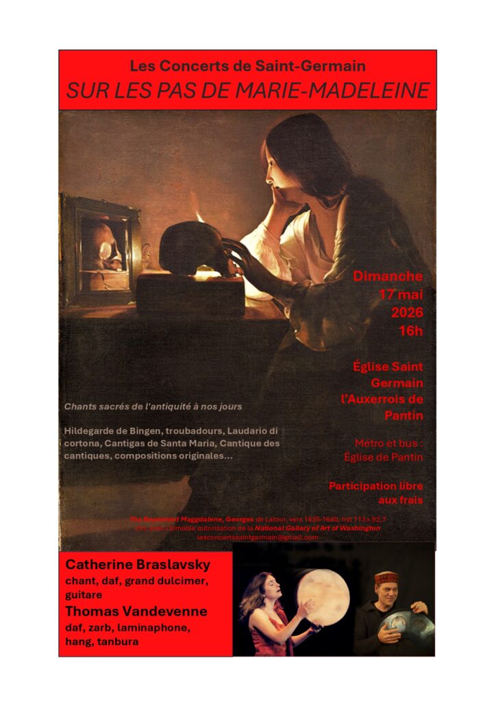 Dimanche 17 mai 2026, à 16h, à l’église Saint Germain de l’Auxerrois de Pantin à lieu un concert de chants sacrés de l’antiquité à nos jours. « Sur les pas de Marie-Madeleine » voici le thème de ce concert avec Catherine Braslavsky (chant, zarb, grand dulcimer, guitare) et Thomas Vandevenne (dan, zarb, laminaphone, gang, tanbura).