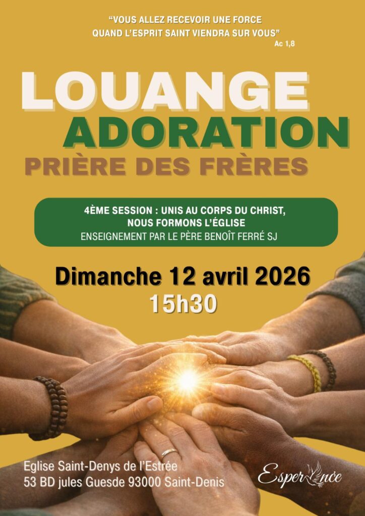 Venez chanter et louer le Seigneur avec le groupe Espérance, dimanche 12 avril, à 15h30, en l’église Saint-Denys de l’Estrée, à Saint-Denis autour du thème “Unis au corps du Christ, nous formons l’Eglise”. Un enseignement sur le sujet sera donné par le Père Benoît Ferré SJ.