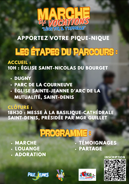 Le Pôle Jeunes convie tous les jeunes de 15 à 35 ans à venir marcher et prier pour les vocations, samedi 25 avril 2026. Rendez-vous à 10h00, à l’église Saint-Nicolas du Bourget, pour le début de cette belle journée sportive et priante en perspective, pour faire Eglise, entre jeunes, et être unis dans la prière autour des vocations.