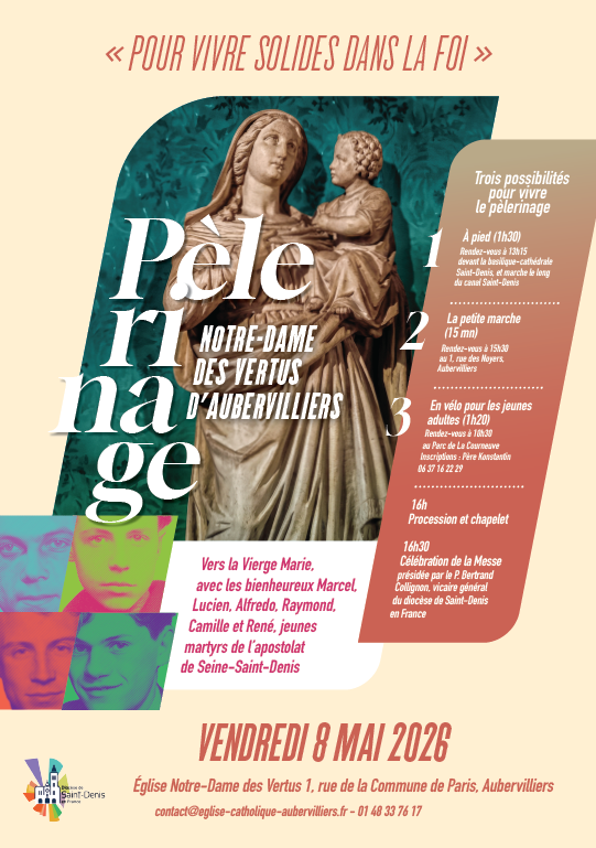 Vendredi 8 mai, les diocésains sont invités à vivre le traditionnel pèlerinage à l’église Notre-Dame-des-Vertus d’Aubervilliers. Trois parcours sont possibles : une pérégrination au départ de la basilique-cathédrale Saint-Denis, un trajet à vélo pour les jeunes adultes depuis La Courneuve, et un trajet court au départ d’Aubervilliers. Notre évêque présidera la messe à 16h30. Venez nombreux !