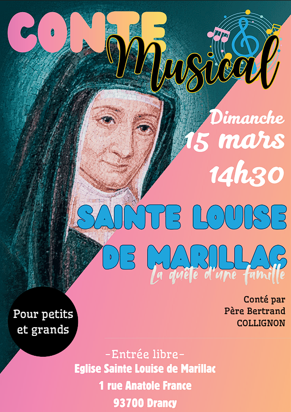 Dimanche 15 mars sera le 4ème dimanche de carême, le dimanche de Laetare qui signifie « réjouis-toi ! ». Alors réjouissons-nous avec Sainte Louise de Marillac, lors de cette journée de fête, de partage et de musique ! À 14h30, le Père Bertrand Collignon nous fera découvrir la vie de Sainte Louise de Marillac, à travers un conte musical vivant et joyeux, accessible aux petits comme aux grands. Un beau moment pour rendre grâce pour la vie de Sainte Louise, montée au ciel un 15 mars ! Alors venez nombreux !