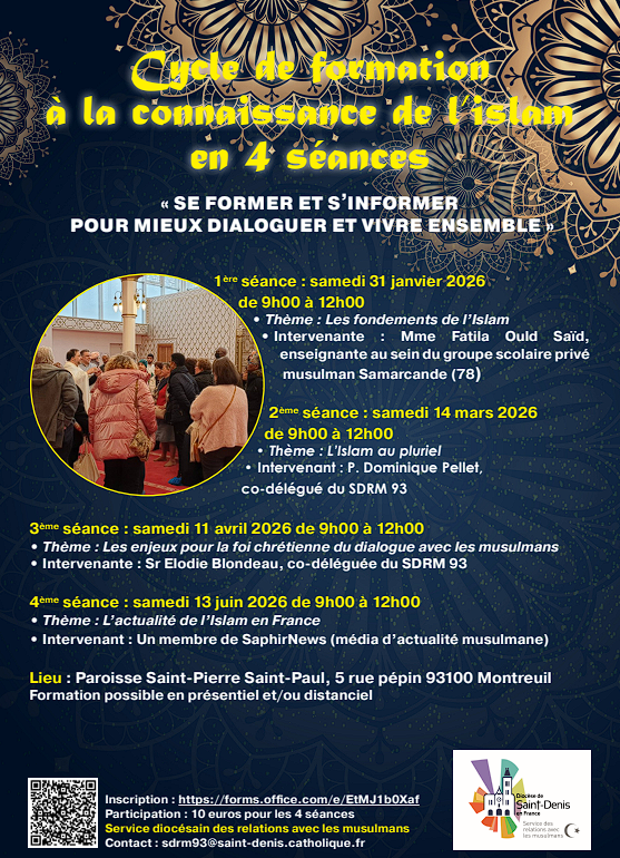 Un cycle de formation à l’Islam, en 4 séances, est proposé par le Service diocésain des relations avec les musulmans afin de se former, s’informer et mieux dialoguer ensemble. La première séance aura lieu samedi 31 janvier 2026, sur les fondements de l’Islam, de 9h00 à 12h00, à Montreuil. La formation est possible en présentiel et/ou distanciel.