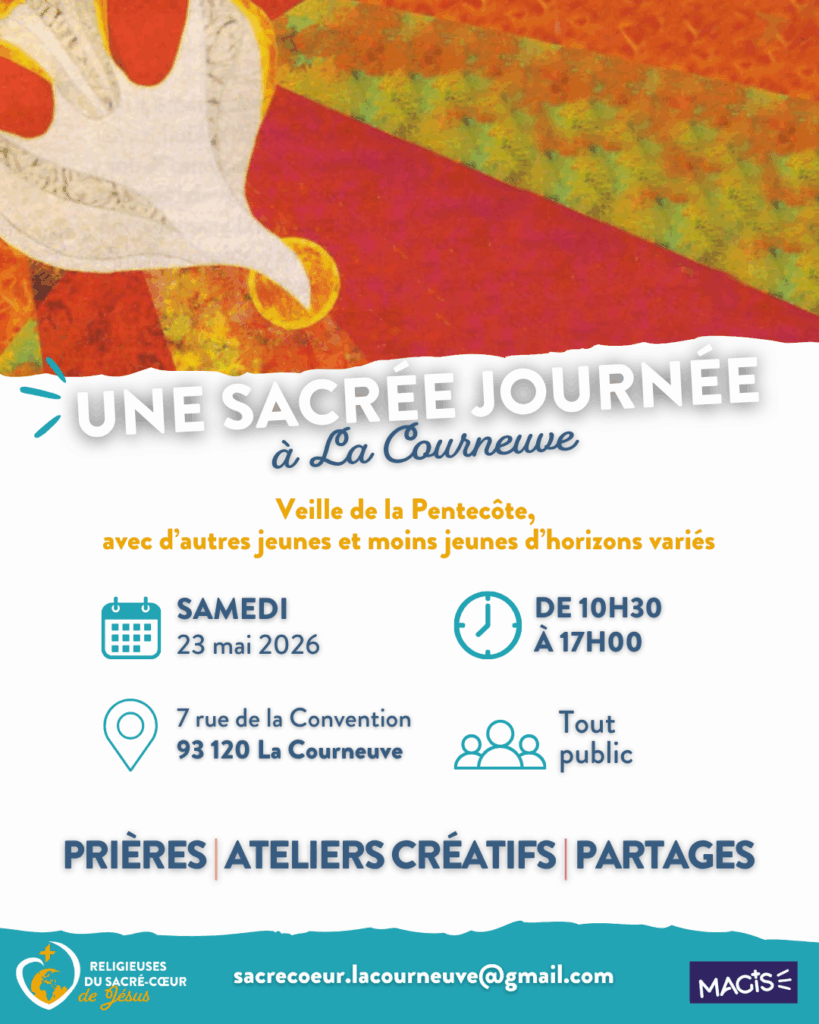 Les religieuses du Sacré-Cœur de Jésus vous convient à une journée de prière et de partage à La Courneuve, afin de vous préparer à accueillir l’Esprit Saint pour la Pentecôte. Pour cela, rendez-vous samedi 23 mai 2026, de 10h30 à 17h00. Une proposition gratuite et ouverte à tous, pour les jeunes et moins jeunes du diocèse, désireux de se détendre et de se ressourcer.