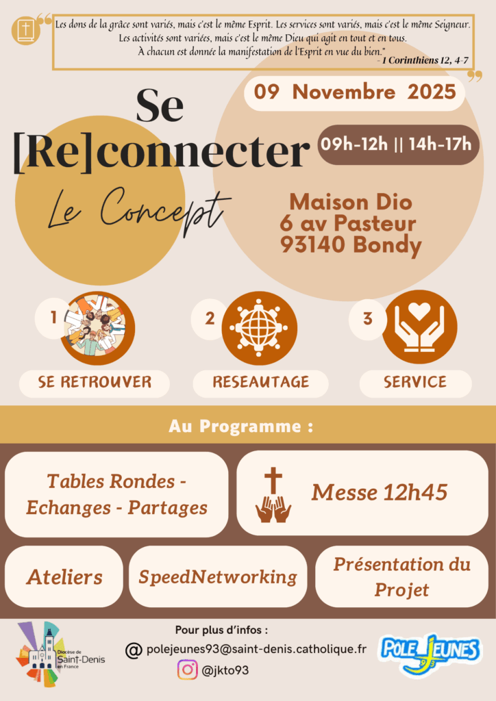 La pastorale jeunes du diocèse propose aux jeunes du diocèse une journée pour se [re]connecter tous ensemble. Prendre le temps de se connaître, partager ensemble, se découvrir, prier, échanger, débattre, collaborer et rendre visible ses talents… Pour cela, rendez-vous dimanche 9 novembre 2025, de 9h00 à 17h00, à la Maison diocésaine de Bondy.