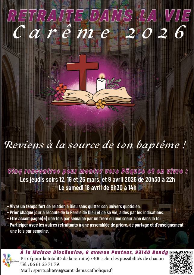 Le service diocésain de la spiritualité vous propose de vivre une retraite dans la vie pour le temps du Carême. L’occasion pour tous de vivre un temps fort de communion avec Dieu au cœur du quotidien, d’être accompagné(e) dans sa foi et de partager et prier avec d’autres… Pour cela rendez-vous jeudi 12 mars 2026, de 20h30 à 22h00, à la Maison diocésaine de Bondy, pour la première rencontre.