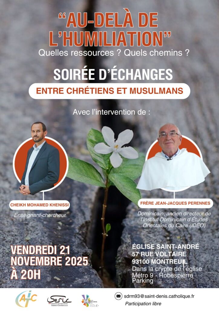« Au-delà de l’humiliation » Quelles ressources ? quels chemins ? Une conférence-débat proposée par le service diocésain des relations avec les musulmans, vendredi 21 novembre 2025, à 20h00, à la Crypte de l’Eglise St André, à Montreuil.
