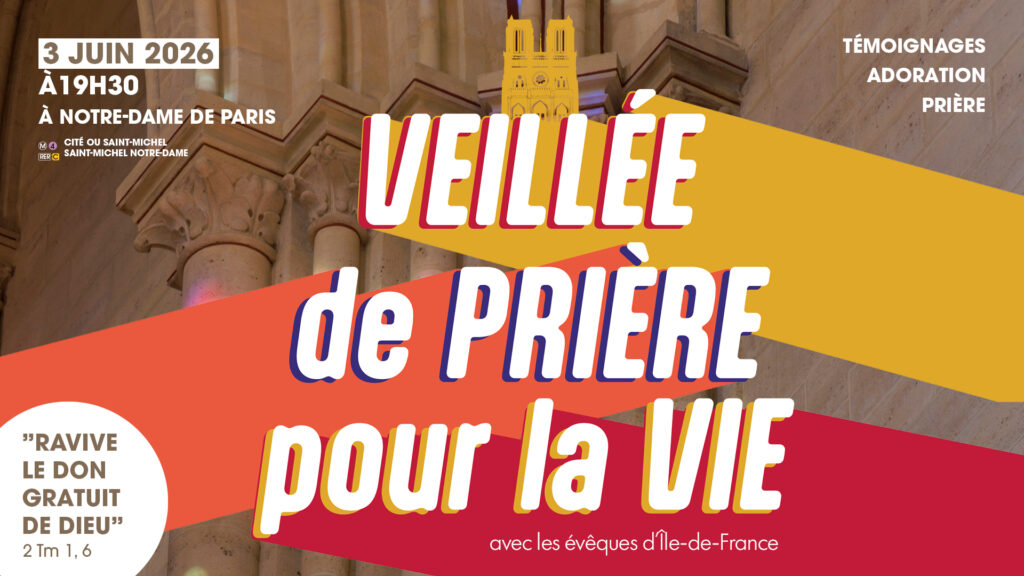 Les évêques d’Ile-de-France vous convient à la 17ème Veillée de prière pour la vie, mercredi 3 juin 2026, à 19h30, à la cathédrale Notre-Dame de Paris. Elle aura pour thème : “Ravive le don gratuit de Dieu” (2Tm 1, 6).